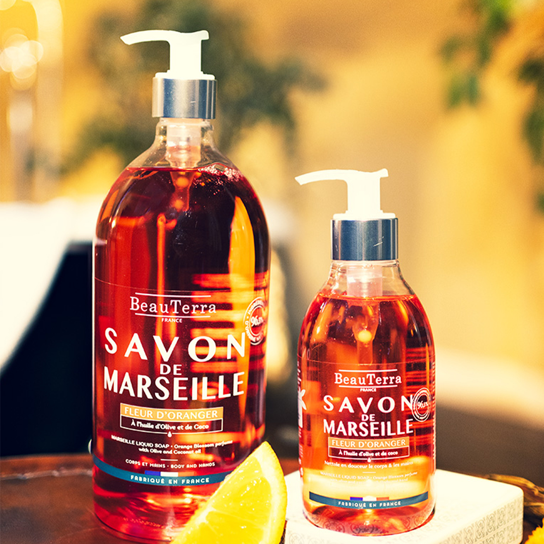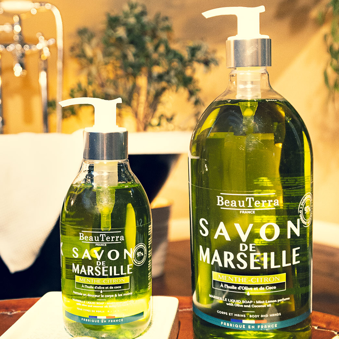 Elaborado con aceite de oliva y de coco, nuestro Jabón de Marsella respeta los procesos de fabricación tradicionales. En formato de 1 L o 300 ml, con agradables fragancias, ¡es apto para la higiene corporal y de las manos de toda la familia!