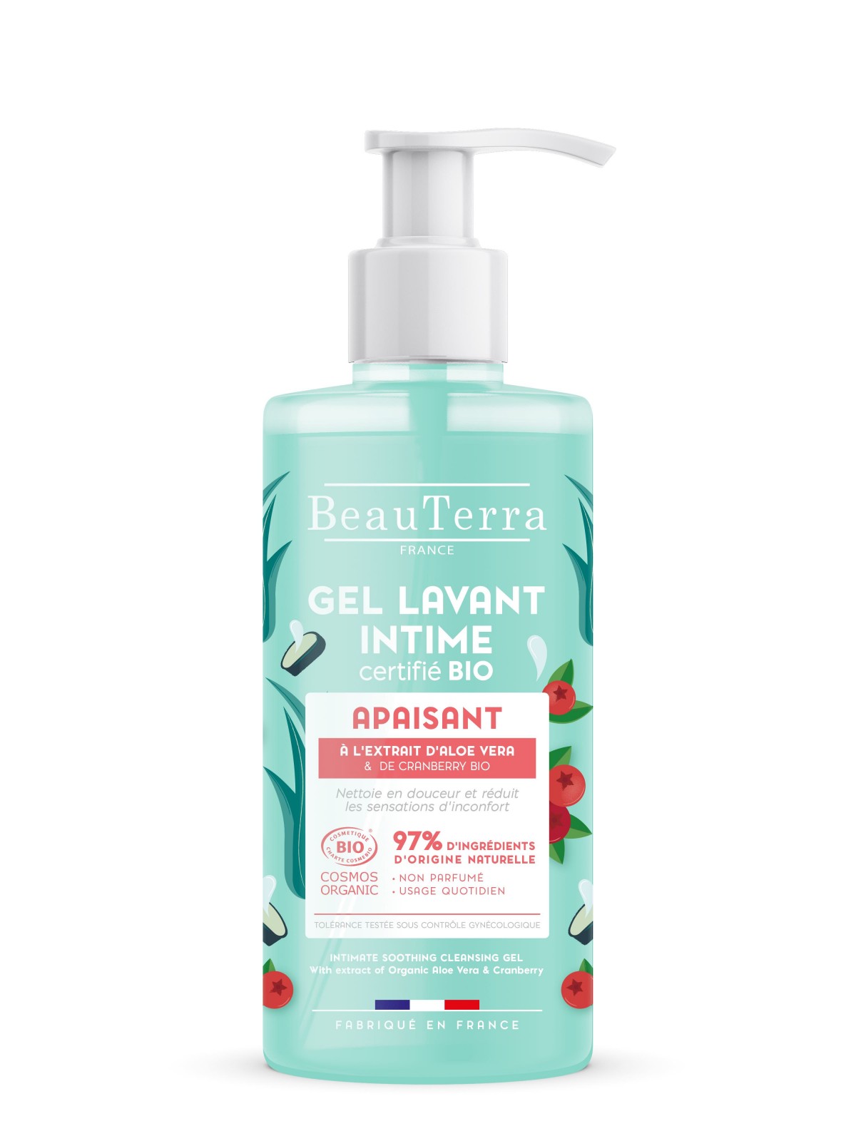 Gel limpiador íntimo calmante con extracto de aloe vera orgánico y arándano para un cuidado suave y sostenible.